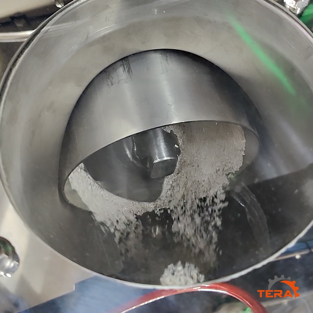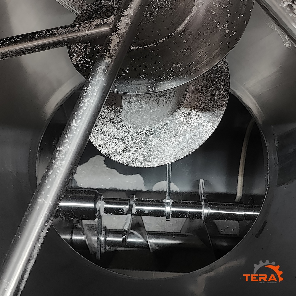 The motorized ploughshare agitator and screw conveyor guarantee a continuous and smooth flow of crystals, preventing compaction and optimizing transfer.
