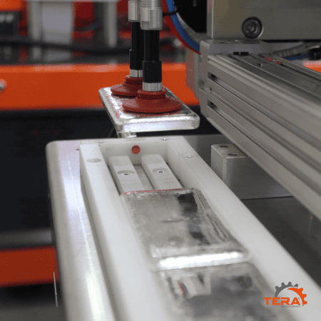 The robot picks up the ingots and stacks them in the ingots collection jig.